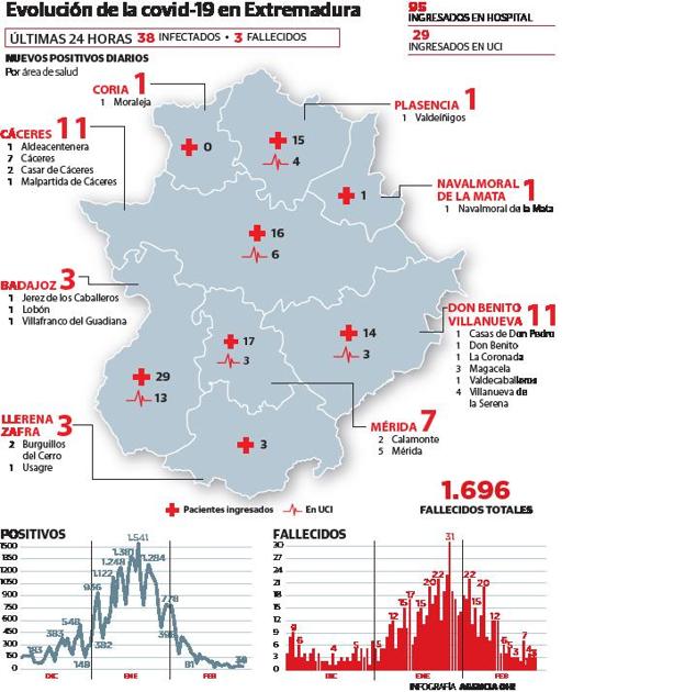 La comunidad informó otras tres muertes por covid y 38 casos positivos confirmados. Una mujer de 84 años Torrecillas de la Tiesa y dos hombres de 60 y 89 años, vecinos El Peñón de la Sierra y Valencia de Alcántara. Desde el inicio de la pandemia hace casi un año, han muerto 1.696 personas en la región.