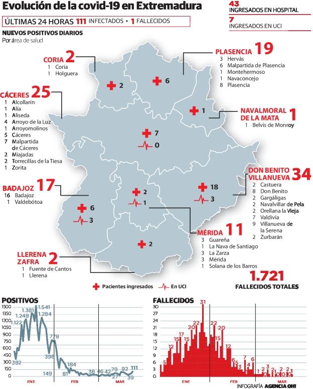 Don Benito-Villanueva de la Serena reporta 34 positivos y tiene 18 hospitalizados, incluidos tres en cuidados intensivos.