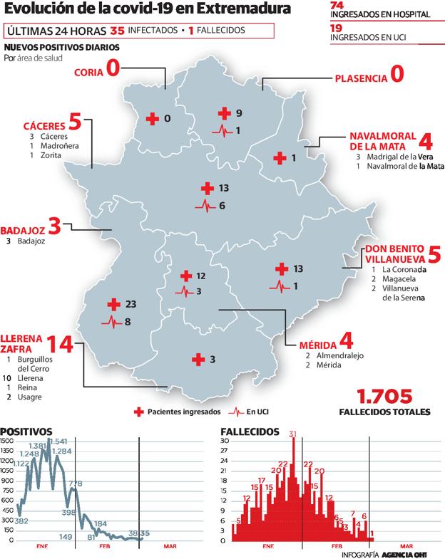 La mortalidad se mantiene pero las infecciones se triplicaron en 24 horas, con 35 nuevos casos, más de la mitad en la provincia de Badajoz (26). Este rebote se produce después de que se informara el lunes la lectura más baja desde el 12 de agosto. Sin embargo, la curva sigue contenida por debajo de los cincuenta positivos diarios (umbral no superado desde el 21 de febrero) y la incidencia a los 14 días es de 51 casos, la más baja del país.