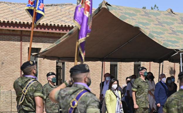 La ministra de Defensa, Margarita Robles, durante su visita a la Brigada de Extremadura en la base del general Menacho en Bótoa. /