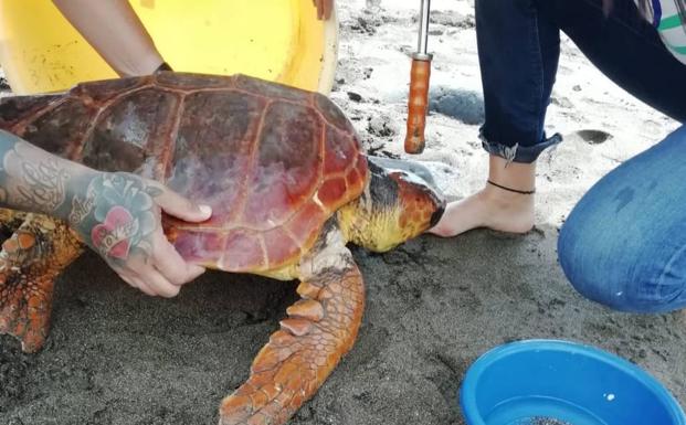 Vecinos y deportistas los soltaron este domingo en El Burrero, playa del municipio de Ingenio, sobre una tortuga atrapada en una red de pesca. Después de un examen, el animal encontró una masa en el tracto digestivo.