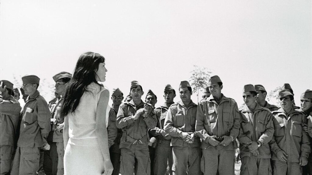 Der Wermutstropfen von Haras Rückkehr nach Spanien: Er musste mit vier Jahren Verspätung noch seinen Wehrdienst nachholen, dem er ursprünglich durch das Studium im Ausland entfliehen wollte. Für die Nachwelt ist das hingegen ein Glücksfall, weil es uns Zeitzeugnisse aus dem Leben der Soldaten in den letzten Jahren der Franco-Diktatur bescherte: Als es für ein paar Monate ins Feldlager ging, schmuggelte Hara verbotenerweise seine kleine Leica IIIf hinein. „Wenn sie mich erwischt hätten, wäre ich immer noch im Gefängnis“, sagt er. Doch er flog nicht auf. Seine Kameraden verpfiffen ihn nicht, sie hielten ihn nur für ein wenig schräg, auch wegen seines Status als „halber Ausländer“. Hara fotografierte zur Schau gestellte, lässige Männlichkeit mit Muskelspielen oder Fluppe im Mundwinkel ebenso wie intimere Momente. Das Bild oben stammt vom ersten Sonntag, an dem die Soldaten Besuch von ihren Familien bekommen durften.
