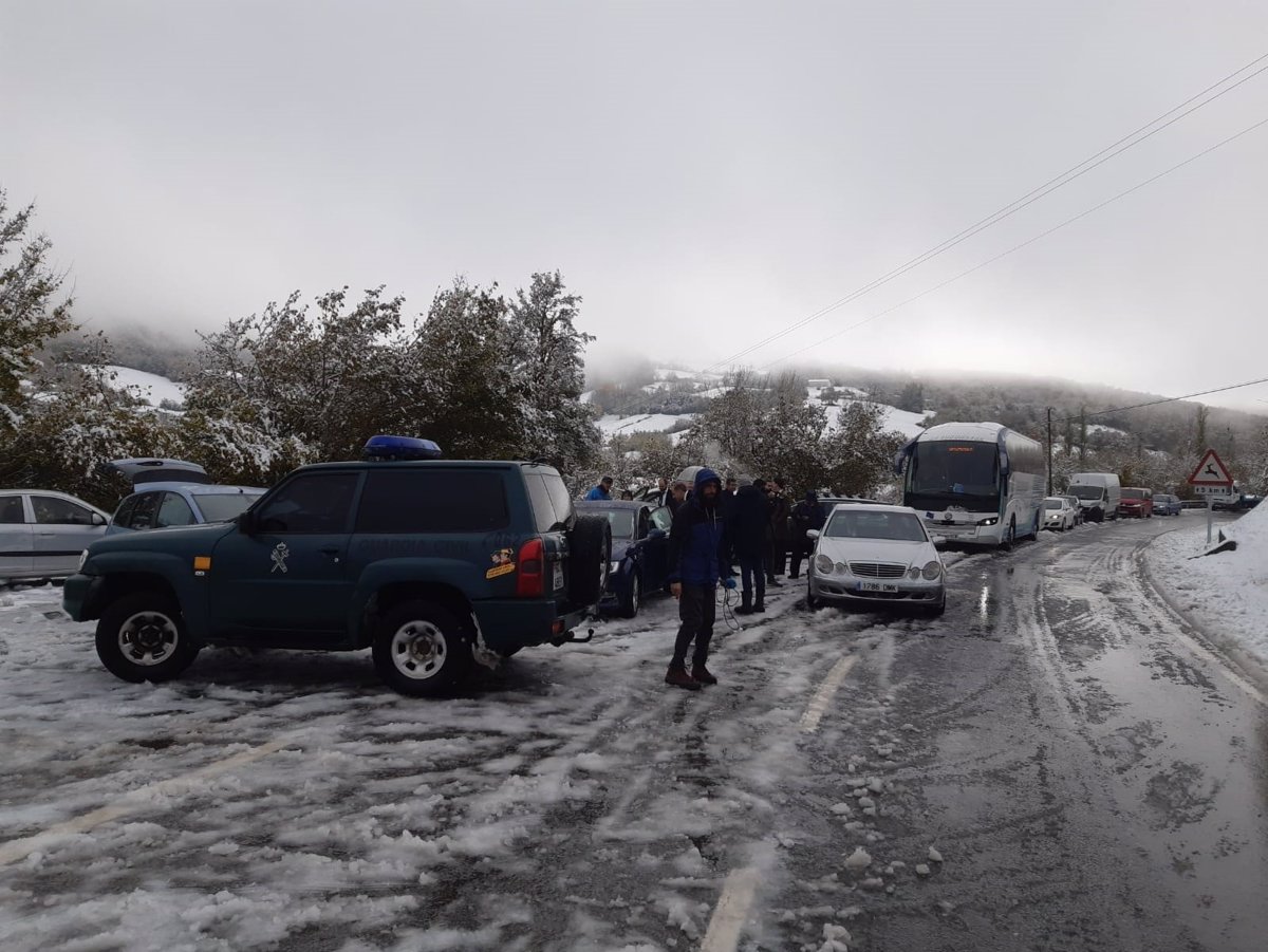 La Guardia Civil ayuda a un autobús que se dirigía a una boda bloqueado por la nieve en el Alto de Mezquíriz